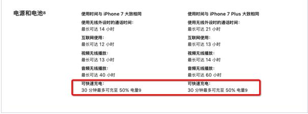 蘋果并沒(méi)有在發(fā)布會(huì)上提及新款iPhone支持快充,當(dāng)然還是有眼尖的網(wǎng)友在官方頁(yè)面注意到蘋果的描述:可快速充電:30分鐘最多可充至50%電量。