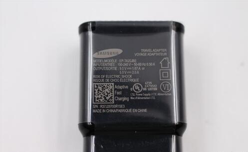 這款充電器型號為EP-TA20JBE,支持100-240V交流電輸入。輸出端為三星自家AFC協(xié)議標(biāo)準(zhǔn):9V/1.67A和5V/2A。充電器由中國工廠代工,使用了英文和法文兩種文字標(biāo)注,但并沒有指明具體的代工廠。