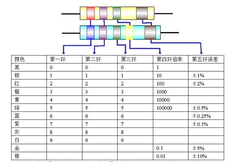 有些直接標注的電阻,是很容易識別的。可是在裝配電子產(chǎn)品的時候,必須考慮到為以后檢修的方便,把標注面朝向易于看到的地方。在手工裝配時,多這一道工序,不是什么大問題,但是自動生產(chǎn)線上的機器沒有那么聰明。而且,電阻器元件越做越小,直接標注的標記難以看清。因此,國際上慣用“色環(huán)標注法”。事實上,“色環(huán)電阻”占據(jù)著電阻器元件的主流地位?!吧h(huán)電阻”顧名思義,就是在電阻器上用不同顏色的環(huán)來表示電阻的規(guī)格。有的是用4個色環(huán)表示,有的用5個。區(qū)別是:4環(huán)電阻,一般是碳膜電阻,用3個色環(huán)來表示阻值,用 1個色環(huán)表示誤差。5環(huán)電阻一般是金屬膜電阻,為更好地表示精度,用4個色環(huán)表示阻值,另一個色環(huán)也是表示誤差。