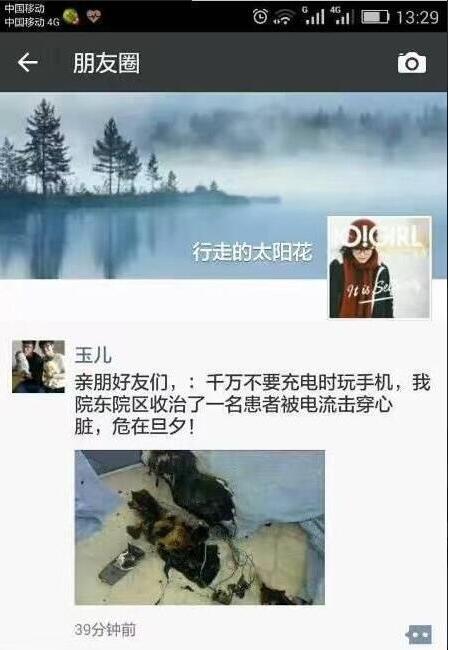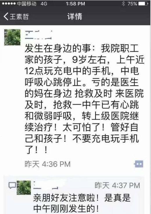 最近,不少莊里人的朋友圈都在轉(zhuǎn)發(fā)這樣一條信息:提醒大家,千萬不要充電時玩手機!河北醫(yī)科大學(xué)第二醫(yī)院兒科東院區(qū)收治一名患者被電流擊穿心臟,危在旦夕!