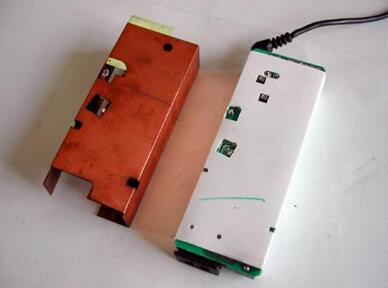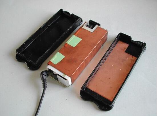2、打開(kāi)適配器的外殼,適配器外還包有銅質(zhì)的屏蔽保護(hù)層,用美工刀隔開(kāi)屏蔽層上的膠帶,再用電烙鐵焊開(kāi)屏蔽層和電路板鏈接上的兩個(gè)焊點(diǎn)(圖3)就可以取下屏蔽保護(hù)層了。
