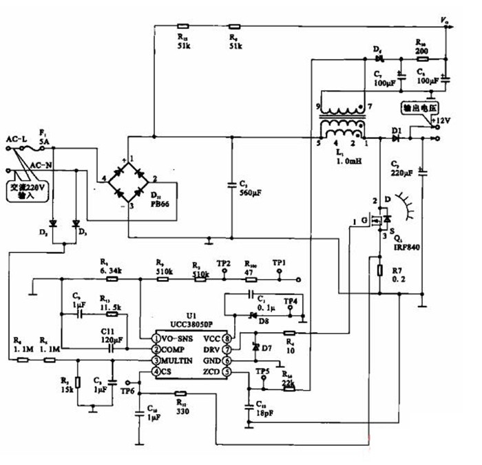 筆記本電腦的電源適配器電路,交流220 V電壓經整流濾波電路后輸出+300 V直流電壓,再經開關振蕩電路Ul (UCC38050P)、開關管控制、變壓器Li變壓、次級整流濾波后輸出+12V的直流電壓。