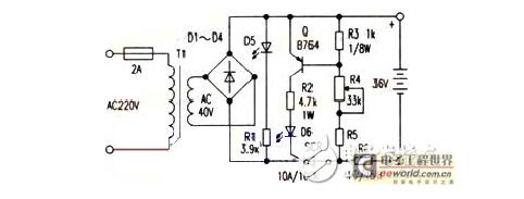 電路原理:AC220V市電經(jīng)變壓器T1降壓,經(jīng)D1-D4全波整流后,供給充電電路工作。當(dāng)輸出端按正確極性接入設(shè)定的被充電瓶后,若整流輸出脈動(dòng)電壓的每個(gè)半波峰值超過(guò)電瓶的輸出電壓,則可控硅SCR經(jīng)Q的集電極電流觸發(fā)導(dǎo)通,電流經(jīng)可控硅給電瓶充電。脈動(dòng)電壓接近電瓶電壓時(shí),可控硅關(guān)斷,停止充電。調(diào)節(jié)R4,可調(diào)節(jié)晶體管Q的導(dǎo)通電壓,一般可將R4由大到小調(diào)整到Q導(dǎo)通能觸發(fā)可控硅(導(dǎo)通)即可。圖中發(fā)光管D5用作電源指示,而D6用作充電指示。