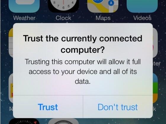 如圖所示,在新版iOS 7中當(dāng)你連接數(shù)據(jù)線之后你還需要手工進(jìn)行點(diǎn)擊來(lái)確保設(shè)備所連接的充電器是否是可信的,如果你在連接到充電器之后跳出這個(gè)信息,你可能需要考慮使用新的充電插頭了。