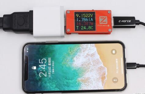 使用小米6 原裝充電器和這條快充線給iPhoneX(剩余電量25%)充電。從ChargerLAB POWER-Z KT001的測(cè)試數(shù)據(jù)線來(lái)看,充電電壓在連接數(shù)據(jù)線一段時(shí)間之后從5V上升到了9V,充電峰值功率最高達(dá)到14.5W,與此前蘋(píng)果官方USB PD充電器的功率相當(dāng)。